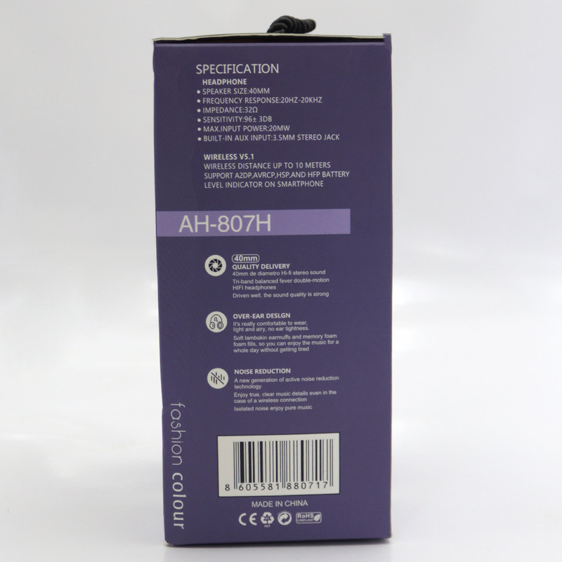 هدفون بلوتوثی مدل AH-807 طراحی بسیار شیک و فانتزی دارد. داخل دسته هدفون و بالشتک های گوشی ها با اسفنج نرم و چرم پوشانده شده و ساعت ها بدون خستگی می توانید از هدفون استفاده نمایید. همچنین سایز دسته ها قابل تنظیم هستند. کلیدهای کنترلی بر روی گوشی سمت راست تعبیه شده که به شما امکان مدیریت کردن موزیک، خاموش و روشن و مکالمه را می دهد. مزیت های قابل توجه هدفون مدل AH-807 دارای ورودی AUX جک 3.5 میلیمتری، خاموش شدن خودکار در صورت عدم استفاده، اتصال از طریق بلوتوث و طراحی ارگونومیک و بسیار شکیل می باشد. مدل های کپی و تقلبی مدل AH-807 در بازار بسیار فراوان است.